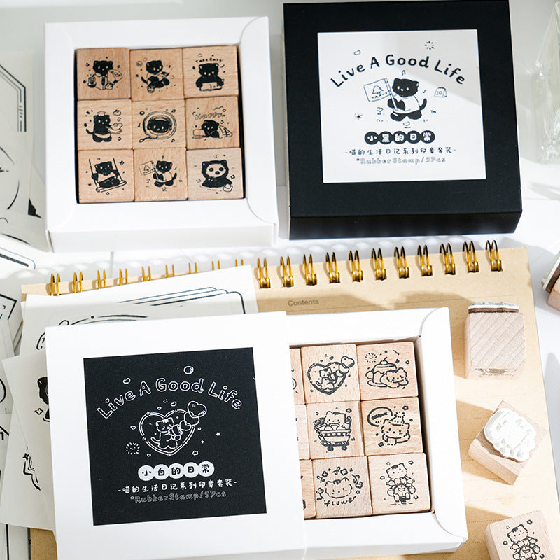 9 Pcs Cat and Bear Wooden Stamp Set MSHRJ